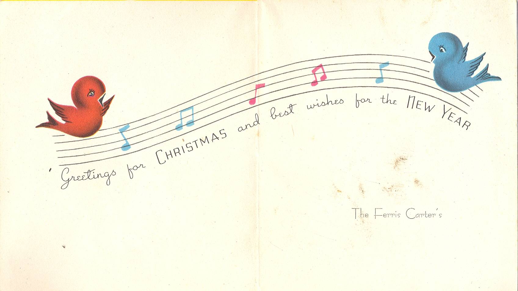Ferris Coulton Carter, 1897-1975, a nephew of Belle, was the son of Andrew Jackson Carter and his wife, Emily Lamunion. Emily was Belle’s sister. Ferris married, in 1922, Goldia H. Willbrandt, 1902-1945. I cannot date this card.