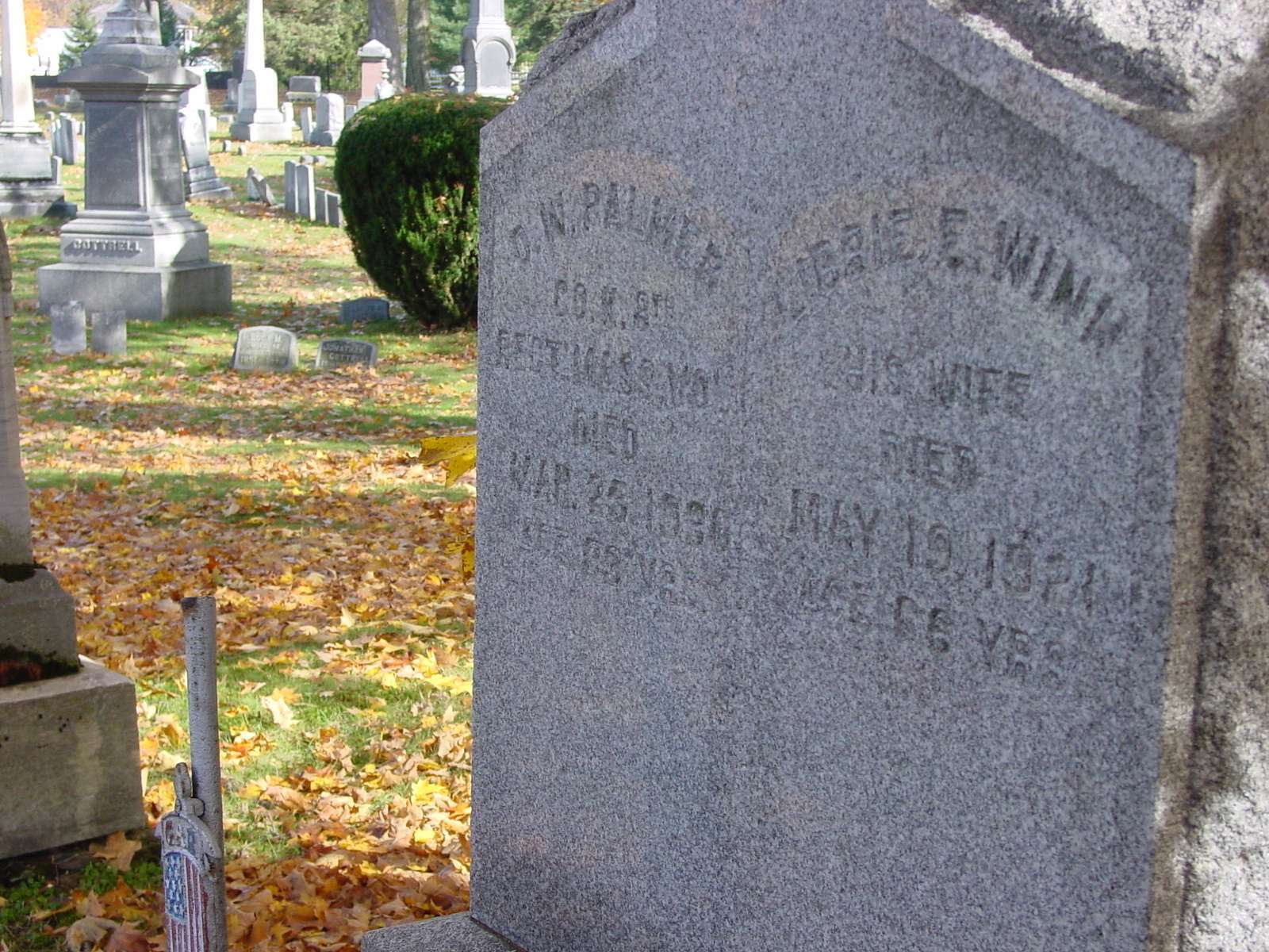 Through the gate, down the hill to the right we found the graves of my great-grandparents and two of their daughters who died young. Orlando William “O.W.” Palmer, 1846-1930, and his wife Libbie E. Winn, 1855-1921 have an impressive old marker on their graves. you can just see the GAR marker that was on the gravesite. My mother’s cousin was instrumental in seeing that the GAR markers were placed on graves of Civil War veterans in the cemetery.