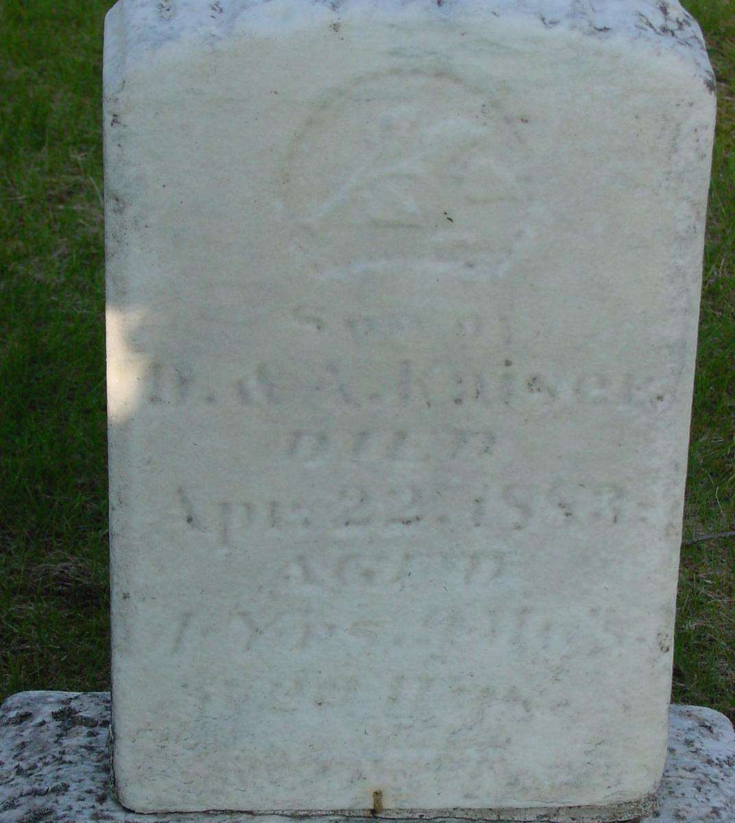 Also on this lot: Daniel Erlin Kaiser, a son of Daniel Kaiser and Amanda VanMeer. This little boy died on 22 April 1883, of scarlet fever. He was the only known natural child of Daniel and Amanda.