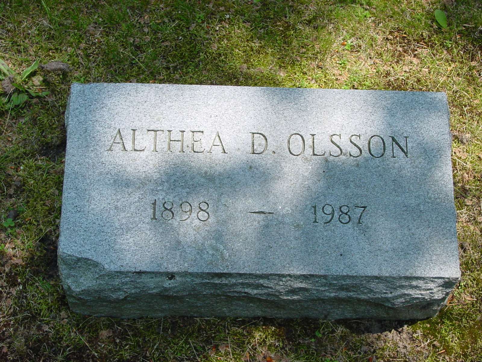 Althea D. (Lamb) Olsson, 1898-1987, was the oldest child of Fred S. and Delia. She was another faithful member of First Congregational, and often sat in the same pew with her brother, Morris. I remember being slightly surprised when she mentioned “my brother”, and I realized the two were siblings.