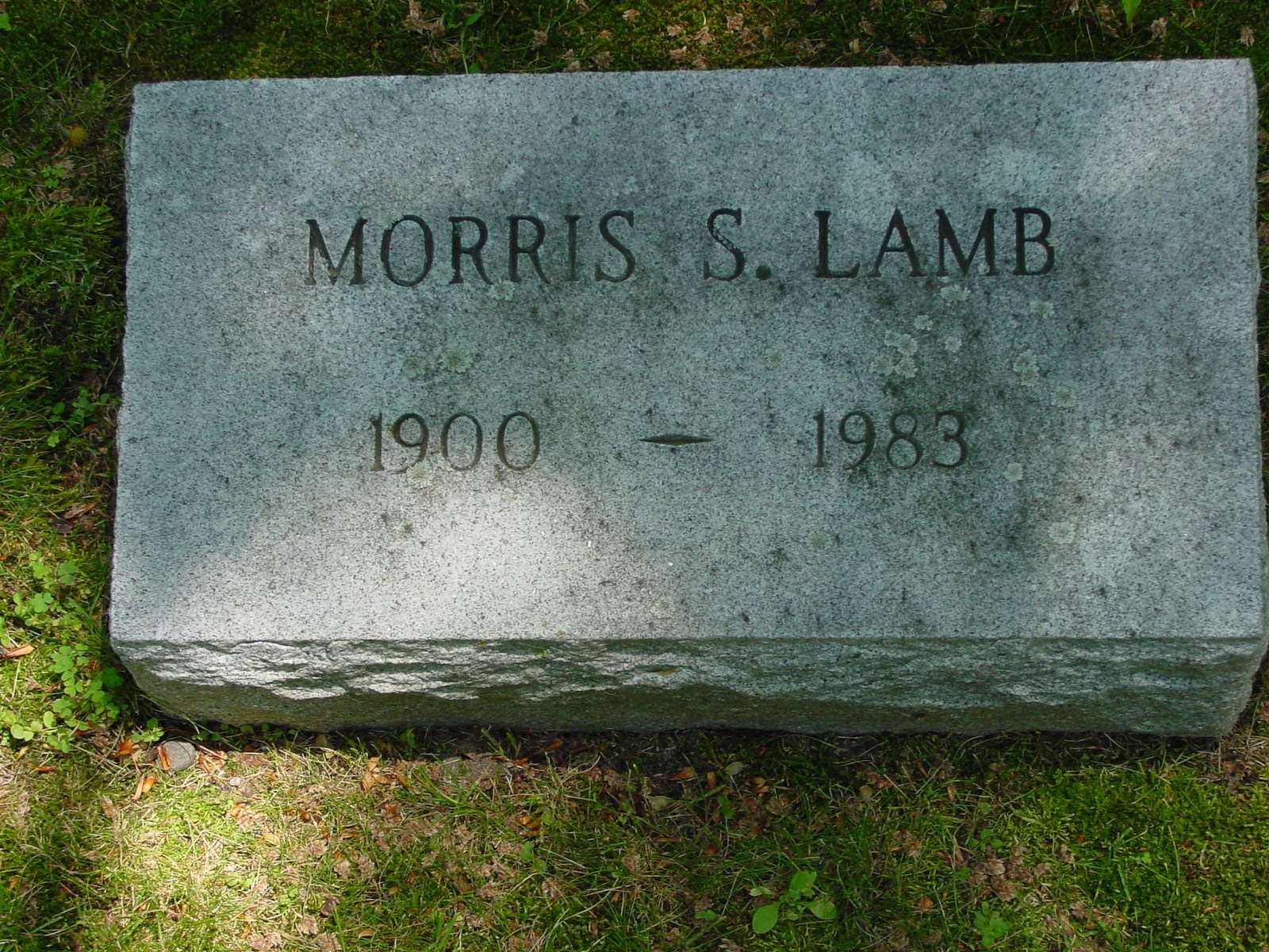 Morris S. Lamb, 1900-1983. Morris was another son of Fred S. and Delia J. Morris and my family belonged to the same church, First Congregational. He was there nearly every Sunday, and I saw him often. His wife, Mary Cecelia Long, 1904-1988, was the cousin I mentioned. She is buried in Mt. Carmel, the Catholic cemetery across the street.