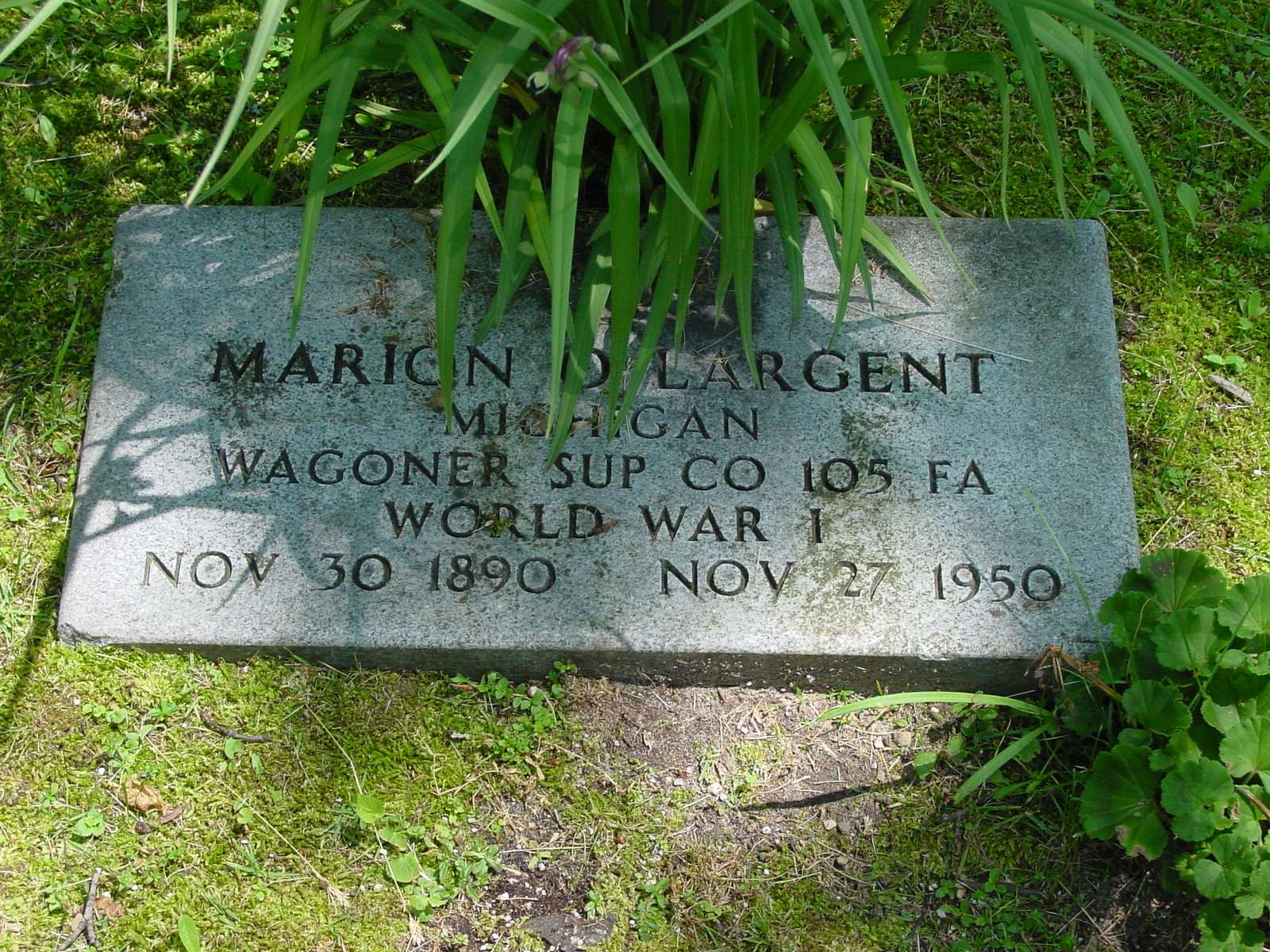 According to the cemetery log books at the Cadillac City Complex, on October 23, 1922, Robert K. Largent was buried on this lot, age 7 months. the remarks column holds this information, “W11 S1”. We did not find a marker for this baby. The owner of the lot, according to the printout at the Cadillac Library is Marion Largent.