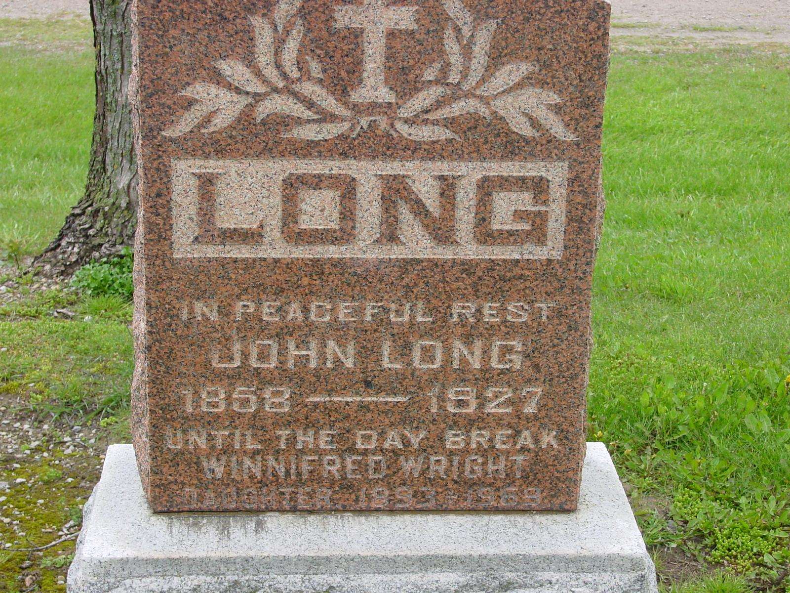 On large monument marks the final resting place of John Long, his wife and their daughter.