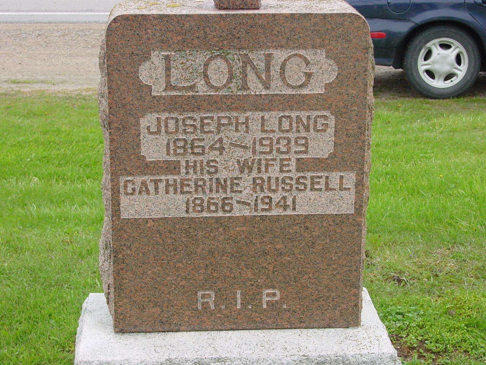 Joseph Long, 1864-1939 and wife Catherine (Russell) Long 1866-1941. Joseph was a brother of John, so he was also my first cousin, three times removed. You can see my car in this photo, showing how close to the highway these graves are.