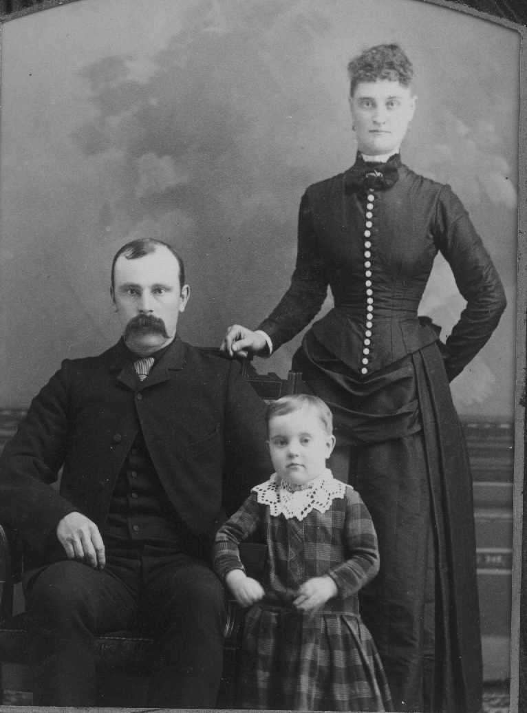 Below is another photo taken in the same studio, perhaps the same day. The picture is of Mary Ann Kaiser with her husband John Garvin and their son Roy. Mary Ann is wearing the same dress in both pictures. Roy was born on March 31, 1885. I believe Roy looks closer to two in the picture, but it’s all a matter of opinion!