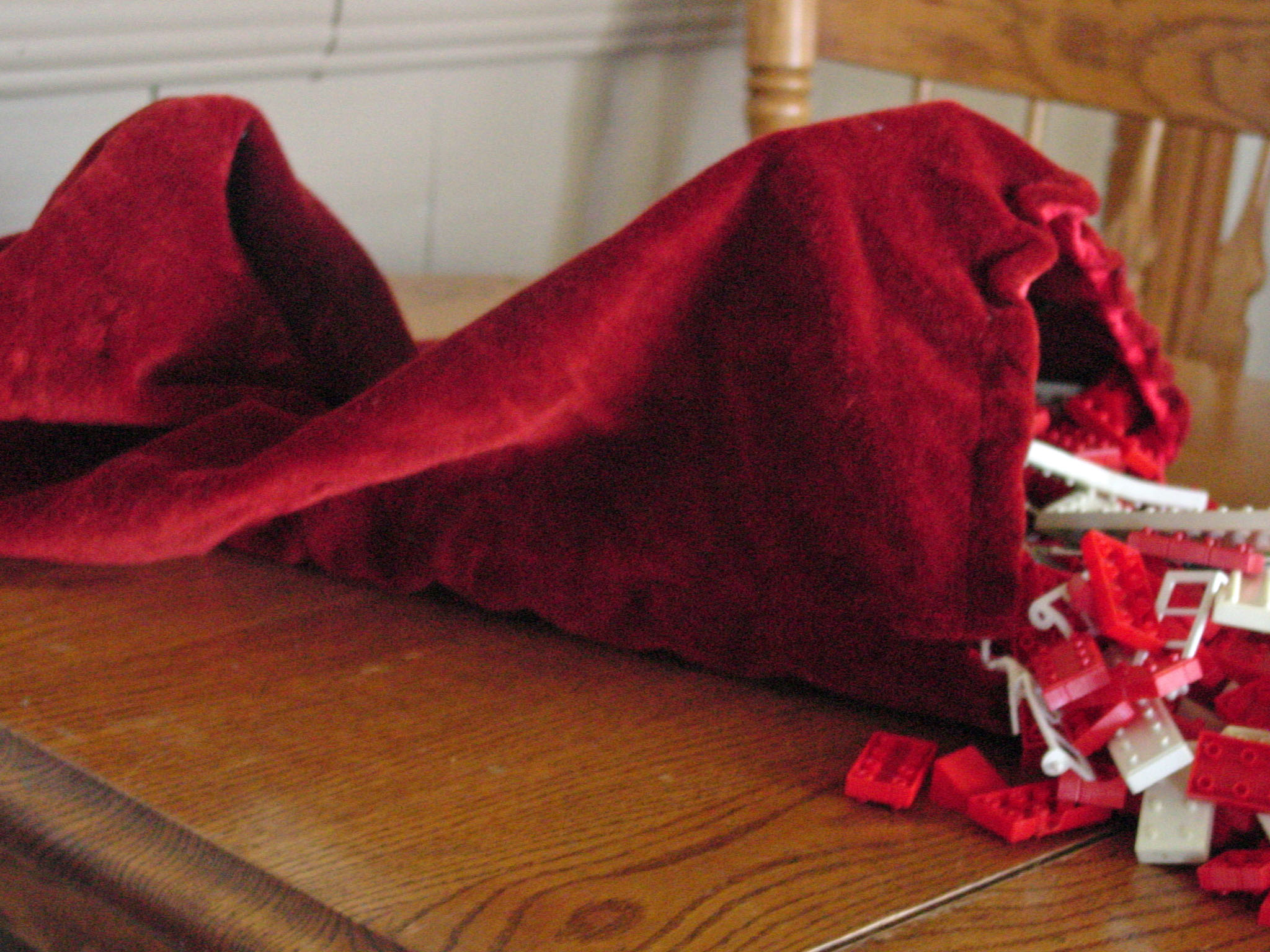 In a big bag on the back shelf in my store room is a toy remaining from Papa’s childhood. The bag is made from some fabric M-in-L had around. A quick search on E-bay shows that many sets of these hard plastic bricks have survived.