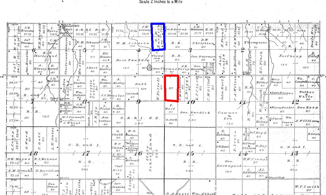 For years, M-in-L has used a nice little hoe with a triangle shape and a sharp point. She has always called it her “Follett Hoe”. A man named Follett lived near M-in-L’s family; he was the maker of the hoe. You can see his name on the Colfax township plat map, look next the the land outlined in red, he lived to the west of that place.