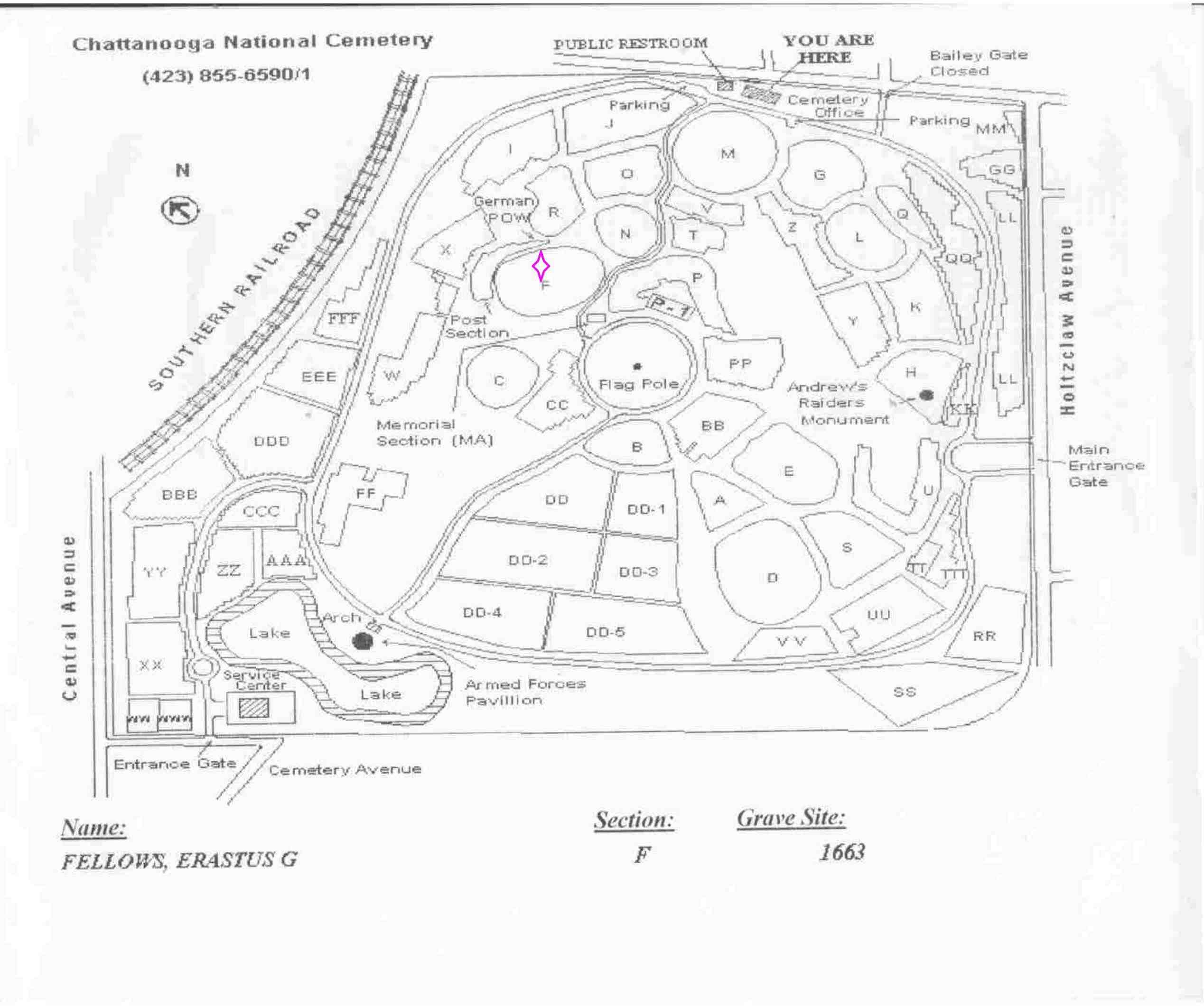 This map prints from a terminal at the visitor center to help you locate a grave. I added the colored diamond, showing the approximate location of Fellow’s grave within the section.
